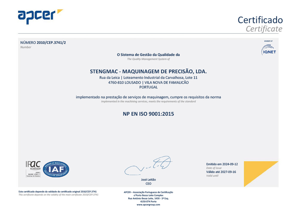 Desde Dezembro de 2018, a STENGMAC tem o seu Sistema de Gestão da Qualidade implementado e certificado pela APCER, segundo os requisitos da norma NP EN ISO 9001:2015, para a atividade de serviços de maquinagem.